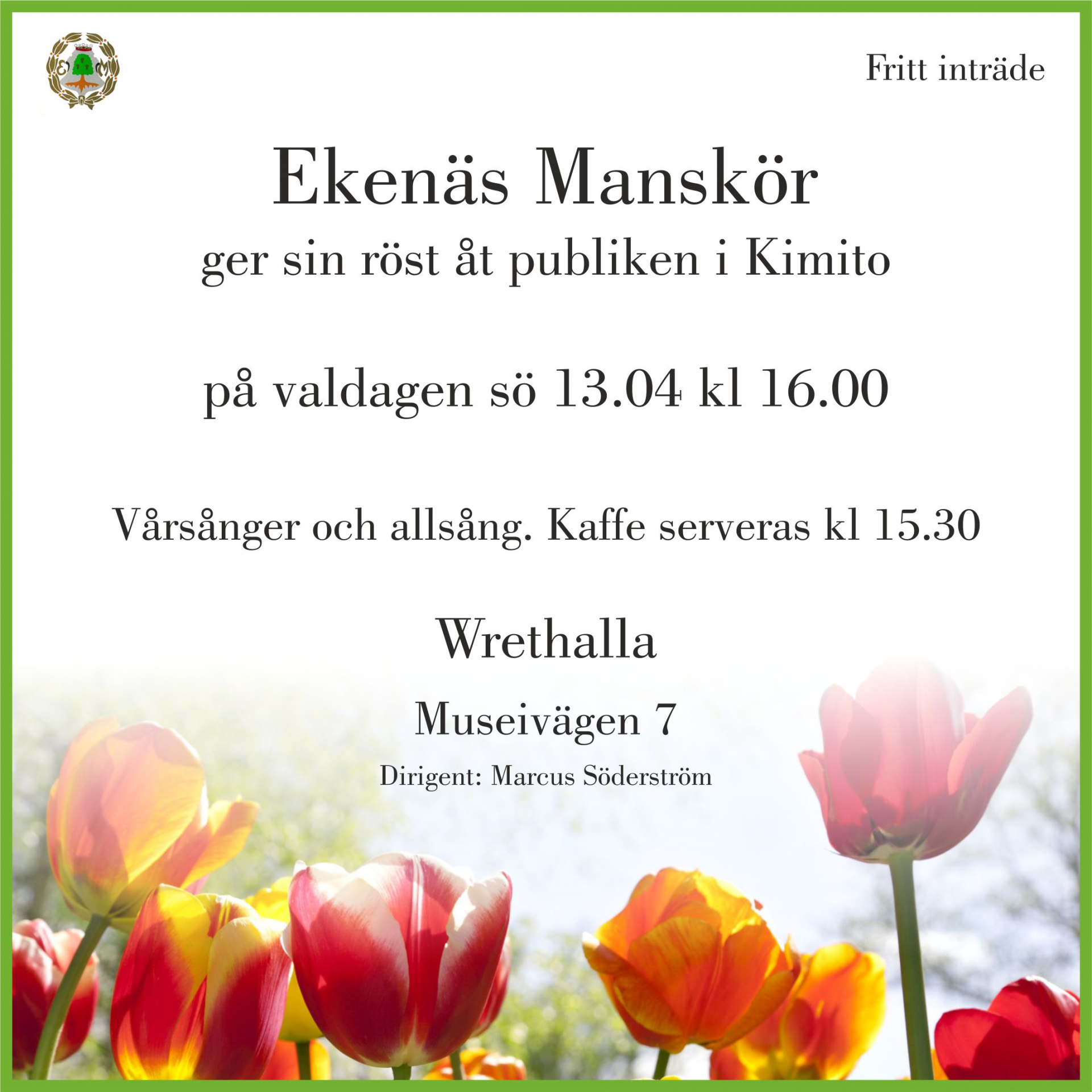 sjunger in våren 1.5.2022 kl. 13.00 i Stallörsparken i Ekenäs.