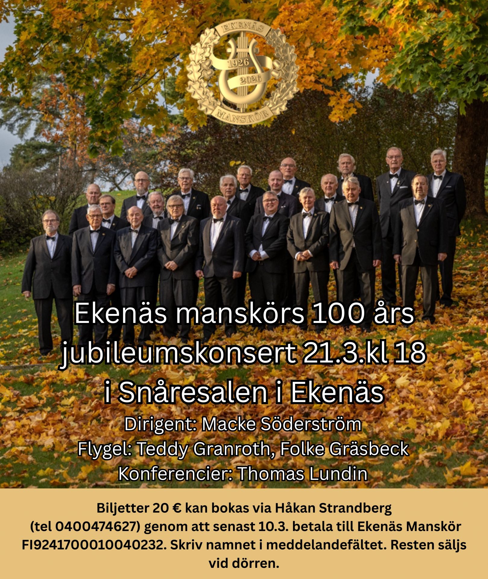 Ekenäs Manskör firar sin 90-års verksamhet med en jubileumskonsert i Sigurd Snåresalen, Raseborgsvägen 6-8, Ekenäs